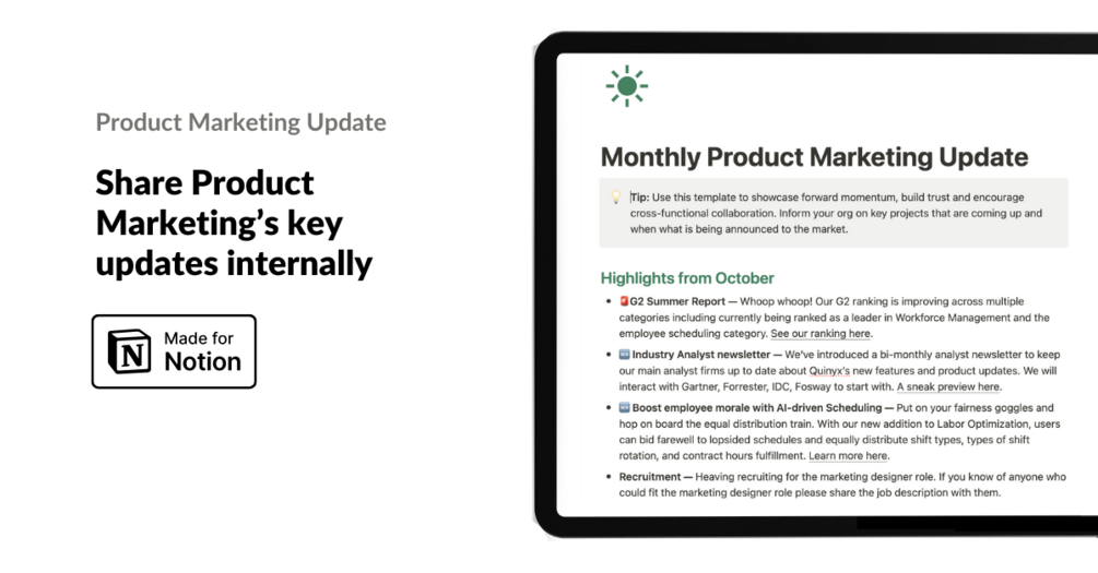 Keep other teams up to date with the latest projects ran by Product Marketing, upcoming launches, positioning updates and more!