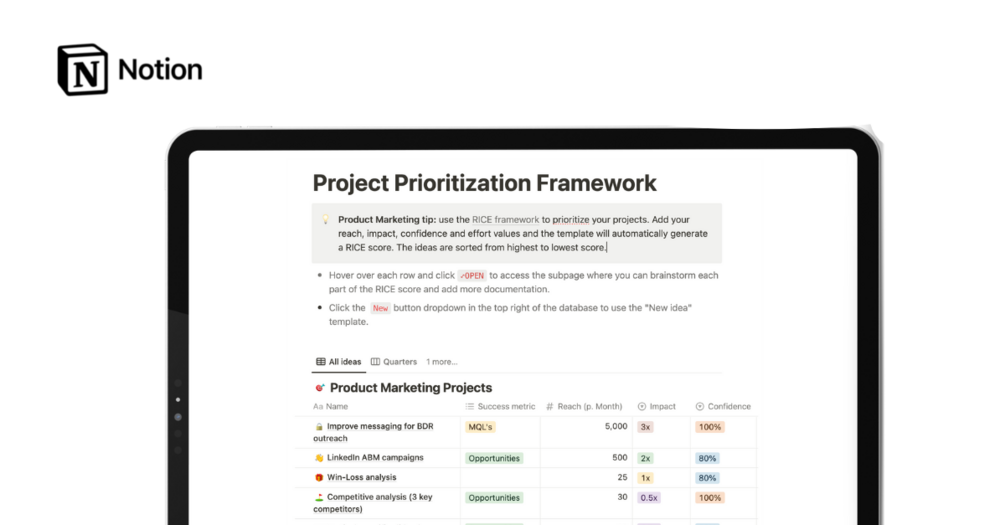 A dashboard to prioritise your product marketing projects based on RICE: four factors for assessing priority.