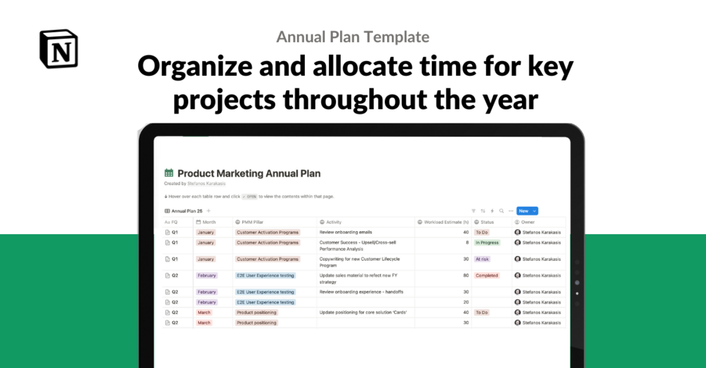 The Product Marketing Annual Plan organizes and helps execute recurring and one-time projects throughout the year, ensuring accountability and clear priorities. It helps align efforts and improve efficiency.
